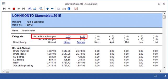 Am Jahreslohnkonto ist in der Rubrik "Anzahl Abrechnungen" ab der 2. Seite ersichtlich, ob es für eine Periode Teilabrechnungen gibt. Ist die Anzahl der Abrechnungen größer 1, so wurden für diese Periode ein oder mehrere Teilabrechnungen erstellt.