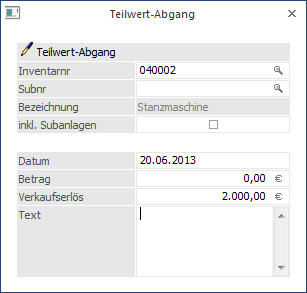 Eingabe des Betrages, mit welchem die Anlage abgeht (Abgangswert inkl. Abgangs-AfA). Aus dem Verhältnis zwischen Abgangswert und Anschaffungswert wird ein Prozentsatz errechnet, der das Verhältnis der normalen Jahresabschreibung zur Teilwertabschreibung angibt. Bei Eingabe eines Minusbetrages wird der Wert des Anlagegutes erhöht.