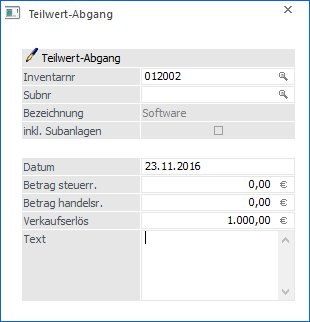 Eingabe des handelsrechtlichen Betrages, mit welchem die Anlage abgeht (Abgangswert inkl. Abgangs-AfA). Aus dem Verhältnis zwischen Abgangswert und Anschaffungswert handelsrechtlich wird ein Prozentsatz errechnet, der das Verhältnis der normalen Jahresabschreibung zur Teilwertabschreibung angibt. Bei Eingabe eines Minusbetrages wird der Wert des Anlagegutes erhöht.