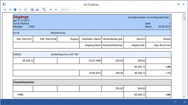 Anhand des Verkaufserlöses und des Abgangsbuchwertes wird der Gewinn bzw. Verlust ermittelt, welcher auf der Liste der Abgänge ausgewiesen wird,