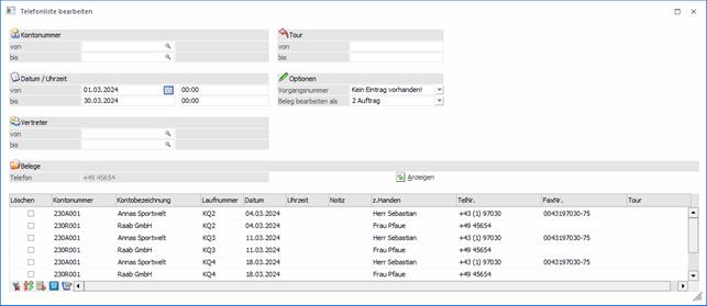 Im oberen Bereich des Fensters, erhalten Sie nochmals die gleichen Selektionskriterien wie schon zuvor beim Starten der Telefonliste (Datum, Uhrzeit, Tour usw.).
