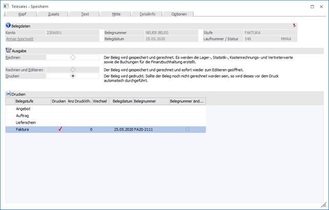 Wurde der Beleg noch nicht mit Rechnen in die Datenbank zurückgeschrieben, geschieht dies bei Bestätigen der Option Drucken. Außerdem wird der Beleg auch auf dem entsprechenden Drucker ausgegeben.