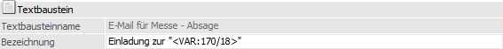 Textbausteine können auch für den Mailversand verwendet werden, wobei im Normalfall das Feld "Bezeichnung" als "Betreff" verwendet wird. Hierbei können auch Variablen (z.B. <VAR: 170/18> im Zusammenhang mit CRM) verwendet werden. Wenn das der Fall ist, dann sollte darauf geachtet werden, dass in der Variable (d.h. in den Daten, die zur Laufzeit eingefügt werden) keine Zeilenumbrüche vorhanden sind, da dieses eine Fehlermeldung verursachen würde.