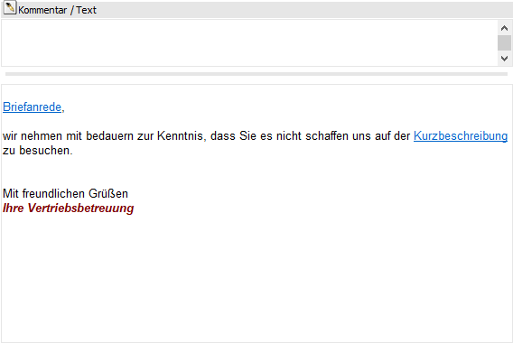 Neben "normalen" Text können mit Hilfe von Ribbon-Buttons auch Sonderfunktionen eingefügt werden. Diese werden in der Regel in Form eines Links dargestellt, welcher einen blau und unterstrichen Text aufweist. Wenn solch ein Eintrag angeklickt wird, dann kann der Inhalt bearbeitet werden.