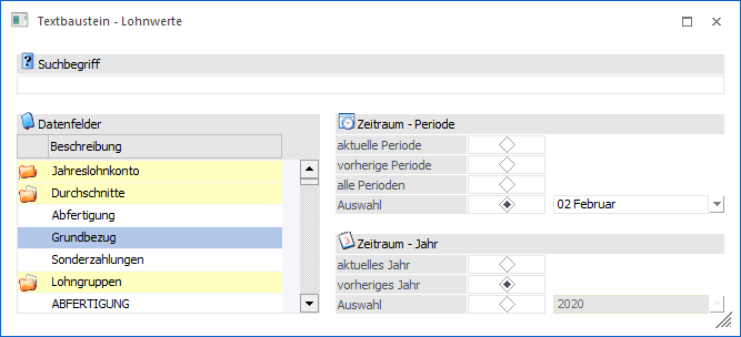 Für die Verwendung von Textbausteinen in der Lohnverrechnung A ist es zumeist erforderlich, auf abrechnungsrelevante Daten (Brutto, Netto, Durchschnitte) zuzugreifen. In diesem Fenster, das beim Bearbeiten von Textbausteinen durch Anklicken des Buttons "Werte" geöffnet werden kann, kann definiert werden, welche Werte eingefügt werden sollen.