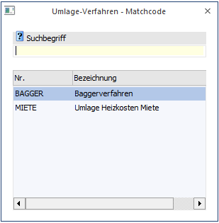 Im Menü Umlage-Verfahren - Matchcode können Sie nach bereits angelegten Umlageverfahren suchen und diese editieren.