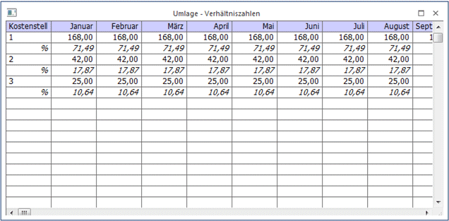 Durch Anklicken des Buttons "Verhältniszahlen" gelangen Sie in eine 12monatige Vorschau mit den bereits berechneten Verhältniszahlen pro Kostenstelle.