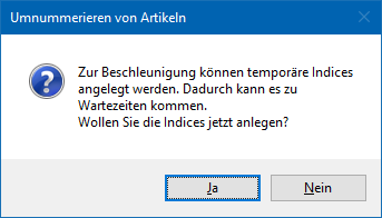 Vor dem Öffnen des Menüpunktes erfolgt eine Abfrage, ob auf bestimmte Tabellen ein Index gelegt werden soll, wodurch die Umnummerierung beschleunigt wird. Hierbei ist zu beachten, dass die Erstellung der Indexe ebenfalls Zeit in Anspruch nehmen kann.