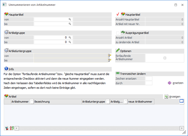 Im eigentlichen Fenster "Umnummerieren von Artikelnummern" kann anschließend entschieden werden, ob die Artikelnummern von Hauptartikeln und / oder Ausprägungsartikeln geändert werden sollen.