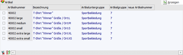 Mit Hilfe des Buttons "Anzeigen" wird die Tabelle "Artikel" gemäß der zuvor getroffenen Selektion gefüllt.