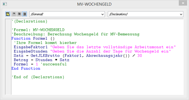 Mit dem Befehl "EingabeFaktor1" wird die Zahl des Monats eingegeben, in dem der AN einen vollständigen Bezug erhalten hat. Diese Zahl wird gespeichert. Mit dem Befehl "EingabeStunden" wird die Anzahl der Tage angegeben, für die der AN Wochengeld bekommt. Mit dem Befehl "Satz = GetJLKBrutto (Faktor1, Abrechnungsjahr()) / 30" wird der Bruttobezug des aktuellen Abrechnungsjahres und des zuvor eingegebenen Monats abgeholt und durch 30 gerechnet. Und mit dem Befehl "Betrag = Stunden * Satz" wird die Anzahl der Tage mit dem errechneten Wochengeld multipliziert.