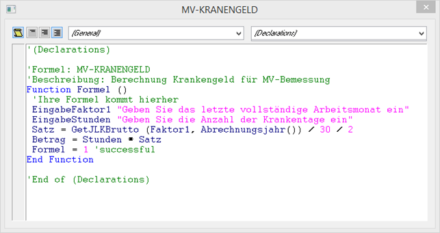 Mit dem Befehl "EingabeFaktor1" wird die Zahl des Monats eingegeben, in dem der AN einen vollständigen Bezug erhalten hat. Diese Zahl wird gespeichert. Mit dem Befehl "EingabeStunden" wird die Anzahl der Tage angegeben, für die der AN fiktives Krankengeld bekommt. Mit dem Befehl "Satz = GetJLKBrutto (Faktor1, Abrechnungsjahr()) / 30 / 2" wird der halbe Bruttobezug des aktuellen Abrechnungsjahres und des zuvor eingegebenen Monats abgeholt und durch 30 gerechnet. Und mit dem Befehl "Betrag = Stunden * Satz" wird die Anzahl der Tage mit dem errechneten Krankengeld multipliziert.