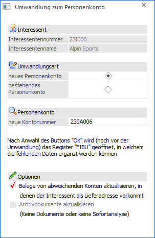 In der Interessentenverwaltung kann ein bestehender Interessent mit Hilfe des Buttons "in Personenkonto umwandeln" in ein bestehendes oder ein neues Personenkonto umgewandelt werde. Die notwendigen Einstellungen hierfür müssen in dem automatisch aufgehenden Fenster "Umwandlung zum Personenkonto" getroffen werden.