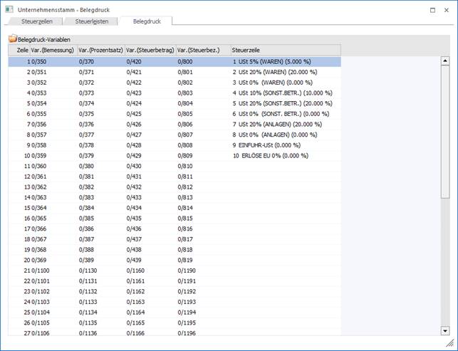 Im Register "Unternehmstamm-Belegdruck" können Steuerzeileninfos für den Belegdruck verschiedenen Variablen zugeordnet werden.