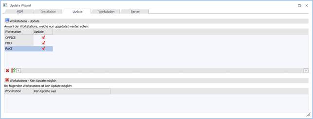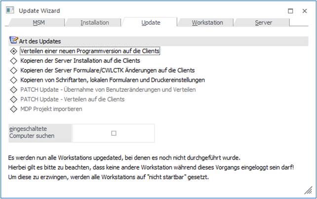 Bei den restlichen Optionen werden in der ersten Tabelle jeweils die Workstations angezeigt, die aktiv sind, und die auch angesprochen werden können. Durch Aktivieren der Checkbox "Update" kann bestimmt werden, welche WS beim Verteilen berücksichtigt wird.