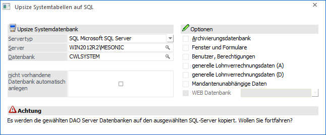 Wenn diese Option aktiv ist, dann wird der Inhalt der mesolohD0.SRV auf den SQL-Server kopiert. Diese Option kann nur bei Einsatz des WinLine LOHN für Deutschland aktiviert werden (wenn die entsprechende Lizenz vorhanden ist).