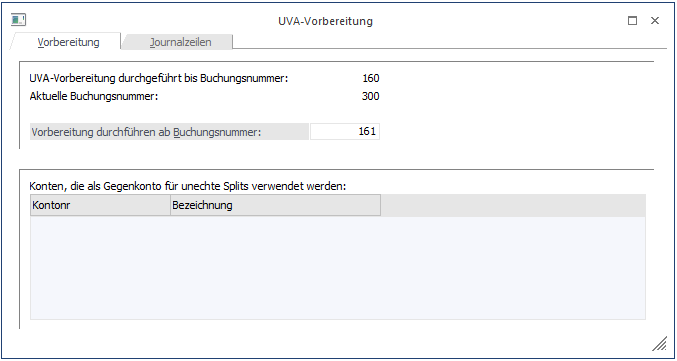 Als Information erhalten Sie die aktuelle Buchungsnummer sowie die letzte Buchungsnummer der letzten UVA-Vorbereitung.