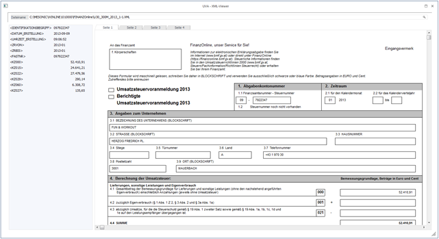 In diesem Menüpunkt, der über Auswertungen/Steuer-Meldungen/UVA - XML-Viewer geöffnet werden kann, können XML-Dateien, die mit Ausgabe der UVA erzeugt wurden, in "lesbarer" Form dargestellt werden.