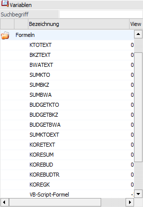 Für nicht alle Felder im Datenstand gibt es eigene Variablen. Dafür stehen der Variablenbereich "Formeln" zur Verfügung, mit denen spezielle Werte (z.B. Kontenwerte [Soll, Haben, Saldo] oder dergleichen) ausgewertet werden können. Welche Formeln zur Verfügung stehen und wie diese verwendet werden, wird im Kapitel List - Formel Parameter beschrieben.