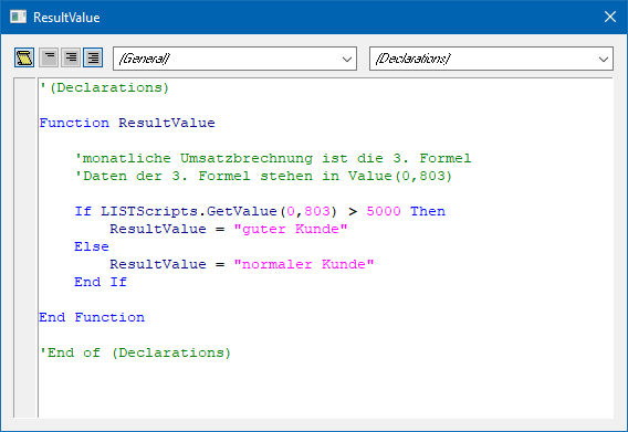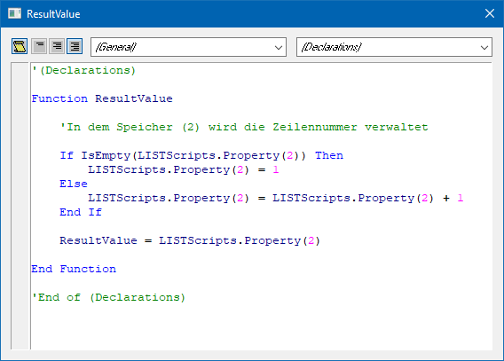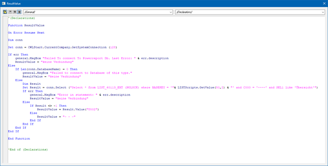 Eine VB-Script-Formel wird immer mit der Tabelle "-2" und "Spalte "0" in den LIST-Aufbau eingefügt. Um eine bestehende Formel zu editieren, muss einfach ein Doppelklick auf "-2" oder "0" erfolgen.