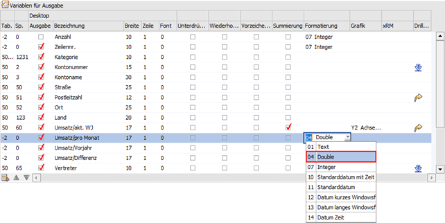 Über die Spalte "Formatierung" in der Tabelle "Variablen für Ausgabe" kann definiert werden, wie die VB-Script-Formel optisch ausgegeben werden soll. In der weiteren Folge wird der Inhalt der Formeln auch entsprechend in den BI-Ausgaben behandelt.