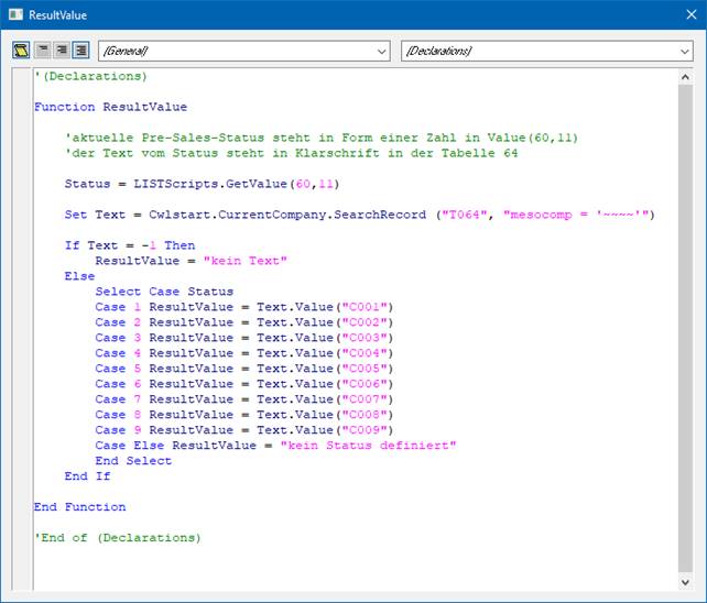 Es stehen die Objekte "CWLStart", "General" und "LISTScripts" zur Verfügung. Die für diese Art von Formeln extra geschaffenen LISTScripts-Objekte beinhalten die Methoden "GetValue" und "Property".
