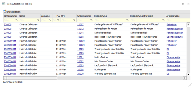 In der Tabelle werden alle selektierten Statistikzeilen angezeigt. Mit Hilfe der Suchzeile kann gezielt und komfortabel nach Verkaufsstatistikzeilen gesucht werden.