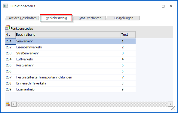 Unter Verkehrszweig versteht man das mutmaßliche Verkehrsmittel, mit dem die Waren das Gebiet Deutschland/Österreich verlassen bzw. in das Gebiet Deutschland/Österreich gelangen. Die entsprechenden Codes können im Register "Verkehrszweig" editiert werden.