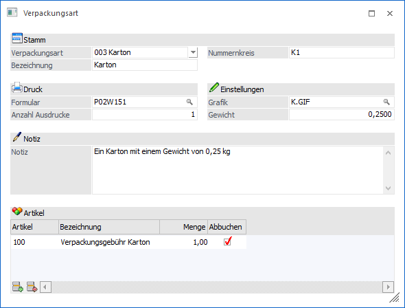 Durch Anwahl des Buttons "Ok" bzw. der Taste F5 wird die Verpackungsart gespeichert.