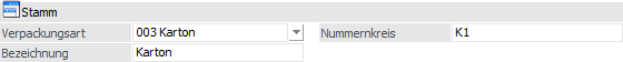 Soll eine neue Verpackung angelegt werden, so ist der Eintrag "Neueingabe" auszuwählen. Ansonsten kann man sich - ausgewählt aus der Auswahllistbox - bereits angelegte Verpackungen anzeigen lassen. Die Verpackungsart wird mit einer 3-stelligen Nummer mit führenden Nullen gespeichert.