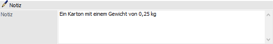 Das Feld Notiz kann dafür genutzt werden, dass nähere Informationen zu dieser Verpackung eingegeben werden können. Die Notiz ist für den Andruck bestimmt. Das heißt, sie kann in allen Listen, in denen die Verpackungsarten (T123) geladen sind, mit angedruckt werden.