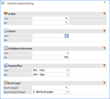 In diesen Feldern erfolgt die Eingrenzung des Auswertebereichs nach der Artikeljournalnummer (ähnlich der PrimaNota Nummer in der Finanzbuchhaltung).