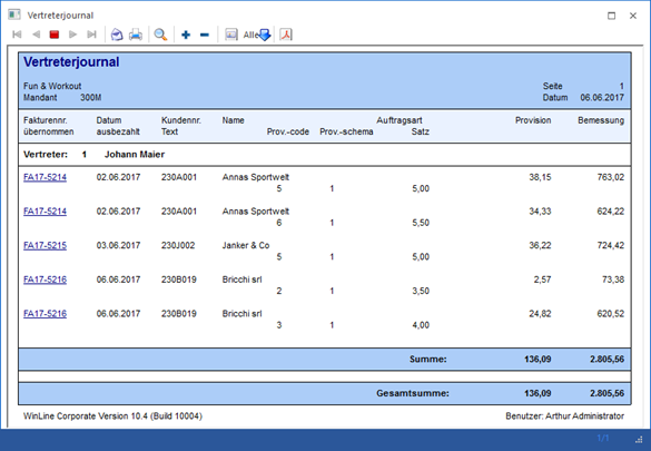 Vertreterjournal werden alle Fakturenzeilen, aufgesplittet auf die einzelnen