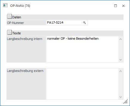 den Feldern der "Langbeschreibung" das Feld "OP-Nummer" befüllt worden