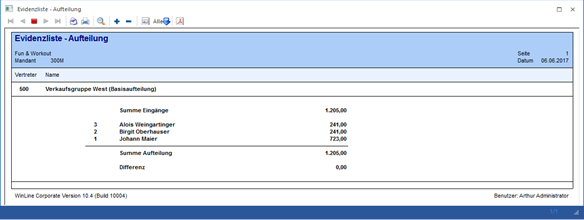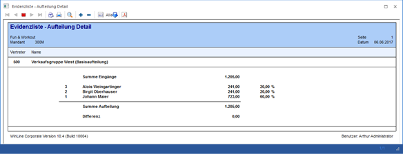 Ebenso wird die Summe der Aufteilung sowie die Differenz zwischen Aufteilungssumme und Summe der Eingänge gebildet und ausgegeben.