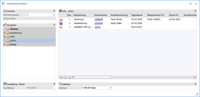 In der Tabelle werden alle Archiveinträge des Vertreters, gemäß der nachfolgenden Selektion, aufgeführt. Die Anzeige eines Archivdokuments kann über 2 Wege erfolgt:
