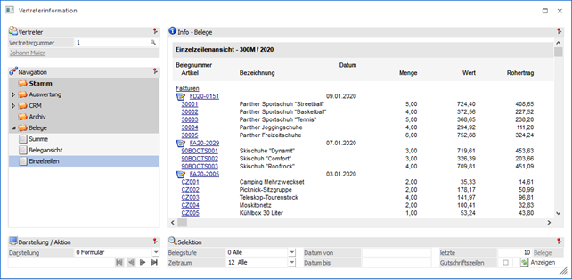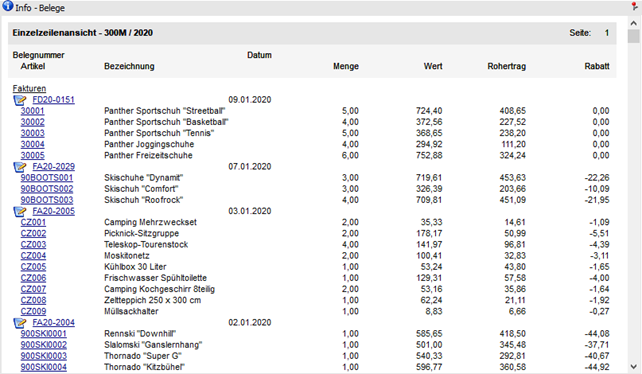 In der Ansicht "Einzelzeilen" werden die Belege mit allen dazugehörigen Einzelzeilen (Artikel) angezeigt.