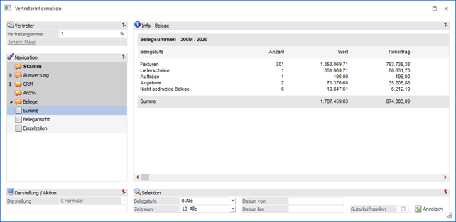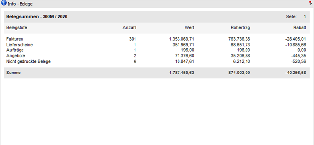 In der Ansicht "Summe" wird für jede Belegstufe eine Summenzeile mit Wert, Rohertrag, Rabatt und Anzahl der Belege angezeigt.