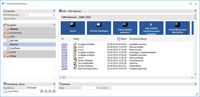 An dieser Stelle werden die CRM-Aktionen, gemäß der nachfolgenden Selektion, dargestellt. Die Art der Anzeige kann mit Hilfe der Option "Darstellung" gewählt werden.