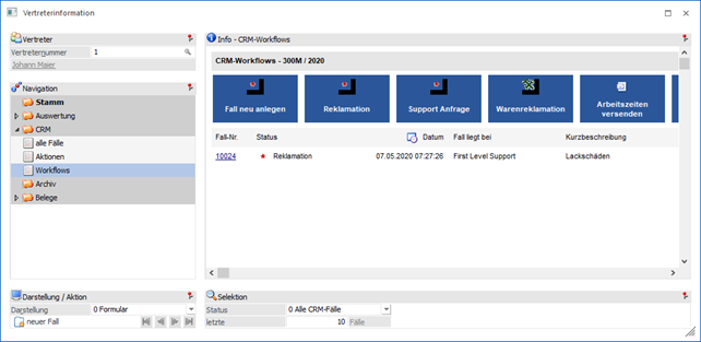 An dieser Stelle werden die CRM-Fälle, gemäß der nachfolgenden Selektion, dargestellt. Die Art der Anzeige kann mit Hilfe der Option "Darstellung" gewählt werden.