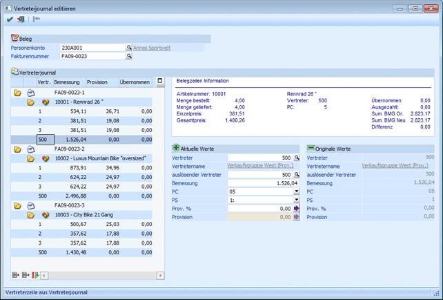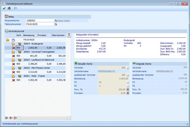 … aufgerufen werden kann, können erfasste Vertreterjournalzeilen (die direkt beim Belegerfassen geschrieben werden) bzw. Übernahmezeilen (aus der Provisionsübernahme) bearbeitet werden.