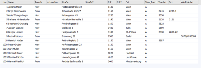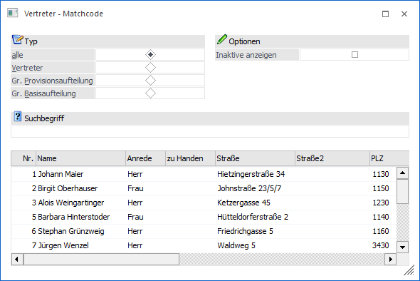 In der Tabelle werden nach Auslösen der Suche (Button "Ok" oder Suchbegriff bestätigen) die gefundenen Vertreter mit ihrer Nummer, dem Namen und diversen weiteren Informationen angezeigt. Per Doppelklick oder Enter-Taste kann der ausgewählte Vertreter anschließend in das Ausgangsfenster übernommen werden.