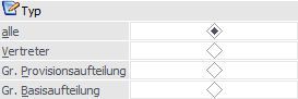 An dieser Stelle definiert werden, ob nach Vertretern, Vertretergruppen (unterteilt in Provisions- und Basisaufteilung) oder nach allen gesucht werden soll.