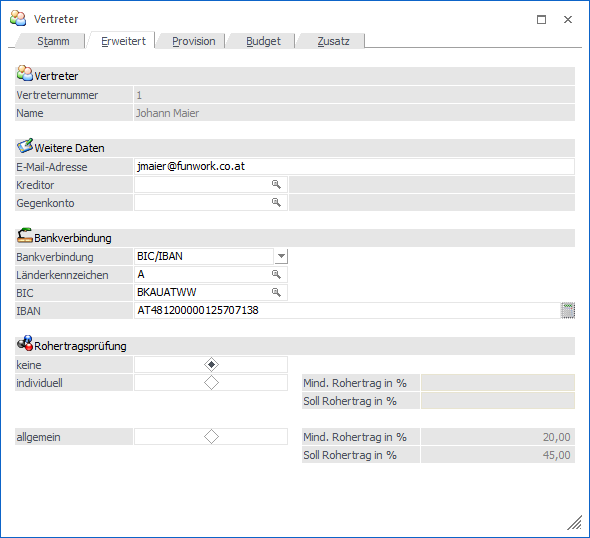 In dem Register "Erweitert" können Bankdaten für einen Vertreter, sowie Einstellung für die Rohertragsprüfung hinterlegt werden.