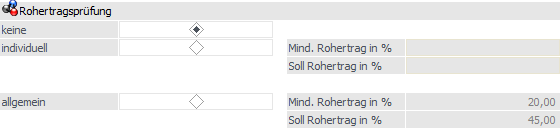 Damit die Rohertragsprüfung (abhängig von der Einstellung in der Artikelgruppe) im Belegerfassen durchgeführt wird, muss an dieser Stelle eine Einstellung getroffen werden: