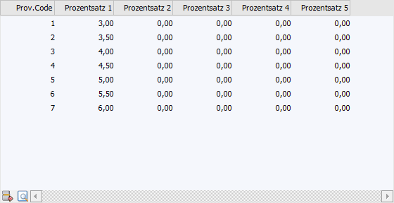In der Tabelle "Provision" werden die Provisionscodes des Vertreters pro Zeile erfasst. Hierbei stehen pro PC 5 Spalten zur Verfügung. Welche Spalte für die %-Ermittlung genommen werden soll, ist abhängig von der Einstellung "Provisionsschema".