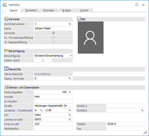 An dieser Stelle wird das Bild des Vertreters dargestellt. Ein neues Bild kann durch Anwahl des aktuellen Bilds oder mit Hilfe des Buttons "Bildersuche" zugewiesen werden.