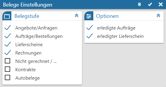 In dem Fenster "Belege Einstellungen" können weitere Einstellungen für die Darstellung des Objekts "Belege" getroffen werden.