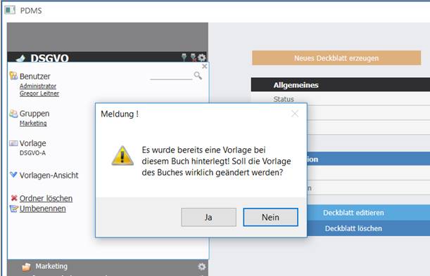 Eine Meldung weißt vor dem Wechsel darauf hin, wenn es bereits mit einer Vorlage erfasste Deckblätter gibt, bevor die neue Vorlage übernommen wird. Mittels "Nein" kann der Vorgang noch abgebrochen werden.