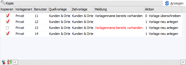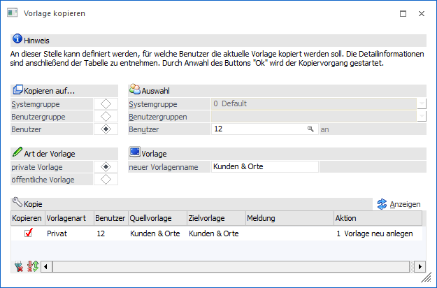 Mit Hilfe der Checkbox in der Spalte "Kopieren" kann definiert werden, für welche Benutzer die Vorlage kopiert werden soll.